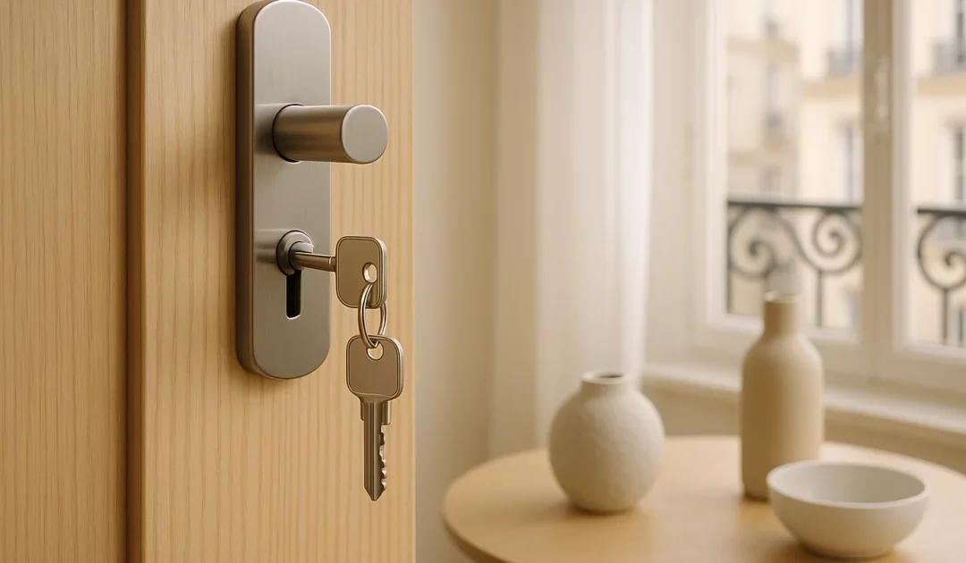Détail d'une serrure moderne sur une porte en bois à Paris, représentant le thème de choisir une serrure pour un appartement à Paris.